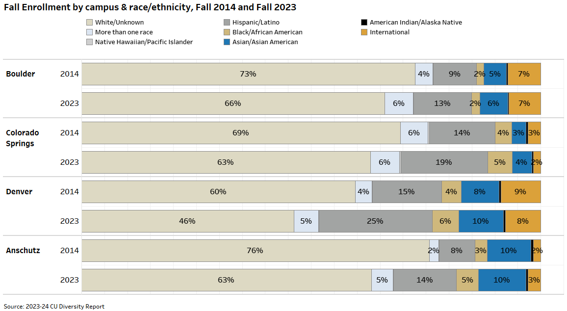 Over the past decade, CU's student population has become increasingly diverse. The report notes a 51% rise in students of color since 2014.