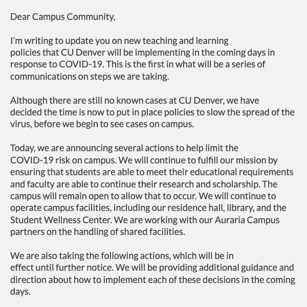 COVID-19 Update: CU Denver to transition to remote teaching and learning https://t.co/FgOIGTxlpS https://t.co/R8RLV6FI0q