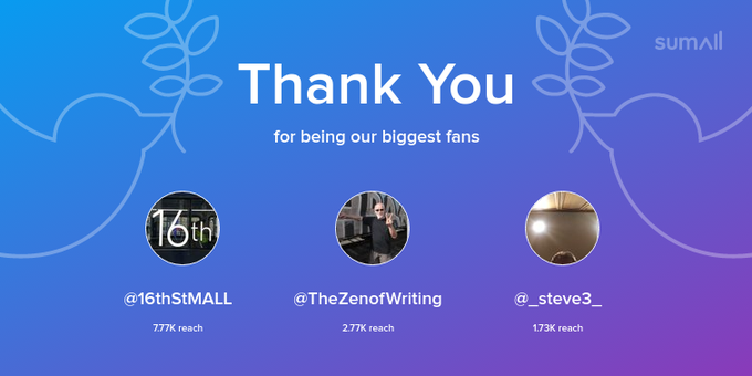 Our biggest fans this week: 16thStMALL, TheZenofWriting, _steve3_. Thank you! via https://t.co/xkhQXyxLf9 https://t.co/jrWk0pEaCD