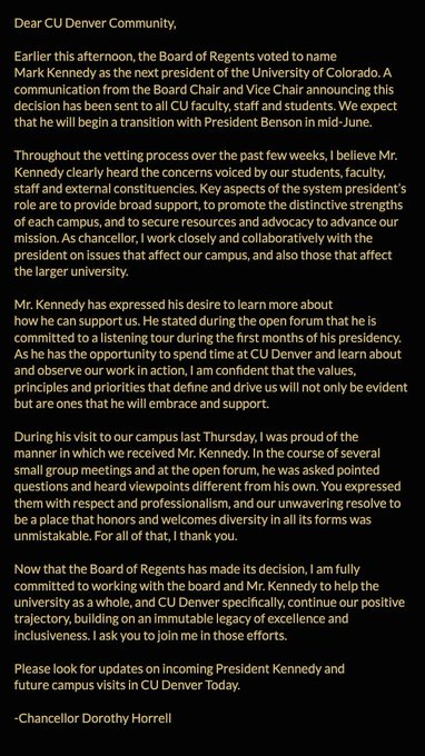 RT @CUSystem: CU Regents name Mark Kennedy president: The University of Colorado Board of Regents today named Mark Kennedy as the… https://t.co/nkH7Lu5s1V