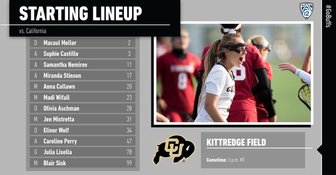 RT @CUBuffsWLax: Here are your Colorado starters for senior day vs. Cal! #GoBuffs https://t.co/bn7Nrc9GQk