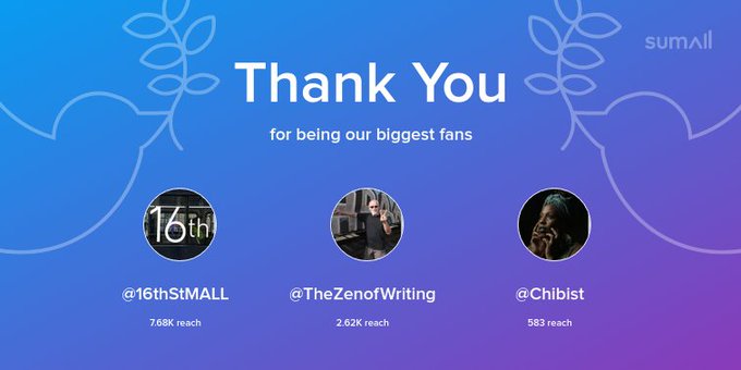 Our biggest fans this week: @16thStMALL, @TheZenofWriting, @Chibist. Thank you! via https://t.co/xkhQXyxLf9 https://t.co/r2BIlNp2ke