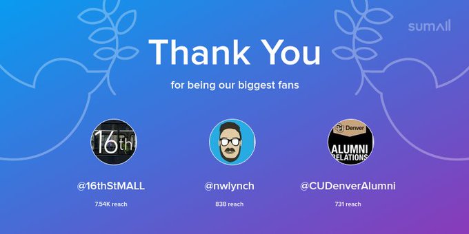 Our biggest fans this week: @16thStMALL, @nwlynch, @CUDenverAlumni. Thank you! via https://t.co/xkhQXyxLf9 https://t.co/hxDbjzjFfs