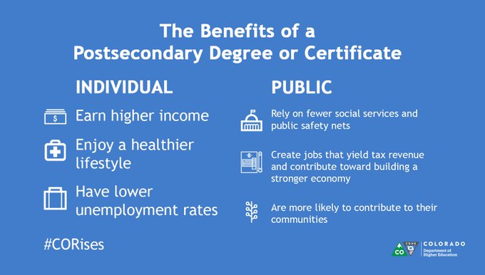 Reaching higher not only benefits you—it benefits our state too! When you earn a postsecondary credential, #CORises. https://t.co/Kivst1Iztb