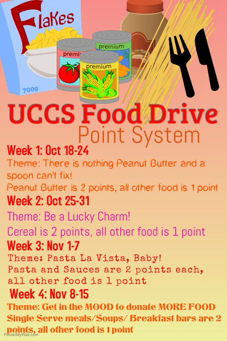 Beginning today, the library will be accepting donations at our Circulation Desk for the #UCCS Food Drive. https://t.co/FNYn1tptE4