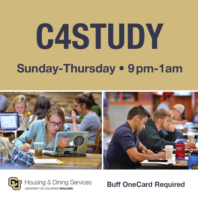 RT @CUBoulderLiving: New on-campus study spot! Convenient, spacious location in C4C east dining center. #CUBoulder #TogetherWeMakeItHome https://t.co/SsakNGD7rZ
