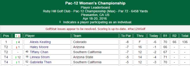 WOW! Looks like Alexis Keating shot a 66 (-6)! Still scores to report, but she's -8 and in FIRST PLACE! #Pac12WGolf https://t.co/xmjDgvRfTy