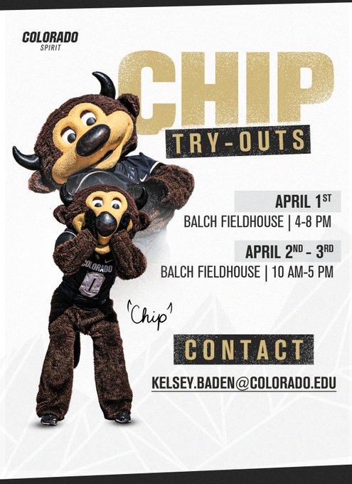 Interested in being @Chipthebuffalo? Now's your shot 👀 Tryouts are April 1-3 at Balch Fieldhouse 🦬 #GoBuffs https://t.co/FOJQ2i0o4a