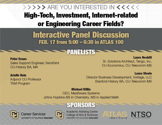 RT @cuatlas: Turn a @CUArtsSciences degree into a career in tech Panel incl @tam_cu alum (and now instructor) Arielle Hein! https://t.co/foiFLKo6oM